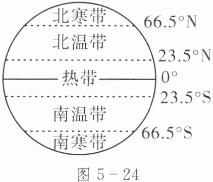 5. 图 5 - 23 为地球仪上的经纬网图,图 5 - 24 为地球五带示意图。读图,完成下列各题。