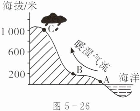 (3) ⑦地是青藏高原地区,夏季气温比东部同纬度的长江中下游平原低很多。气象工作者在某山地(图 5 - 26)的 B 处测得的气温是 14.8℃,则 C 处的气温约是____℃;山地迎风坡和背风坡的降水也有很大差异,迎风坡降水____。