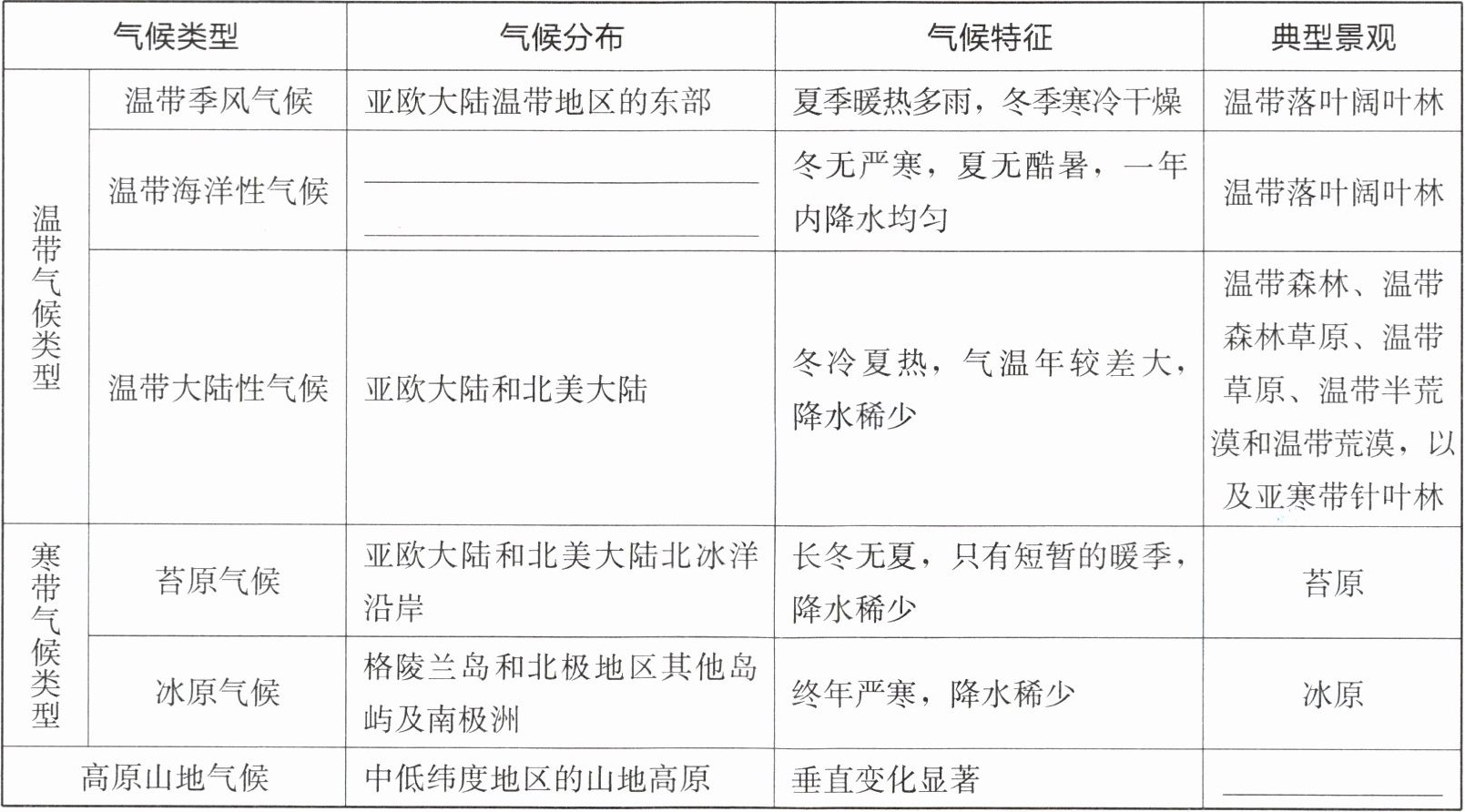 |温带海洋性气候|______|冬无严寒,夏无酷暑,一年内降水均匀|温带落叶阔叶林|