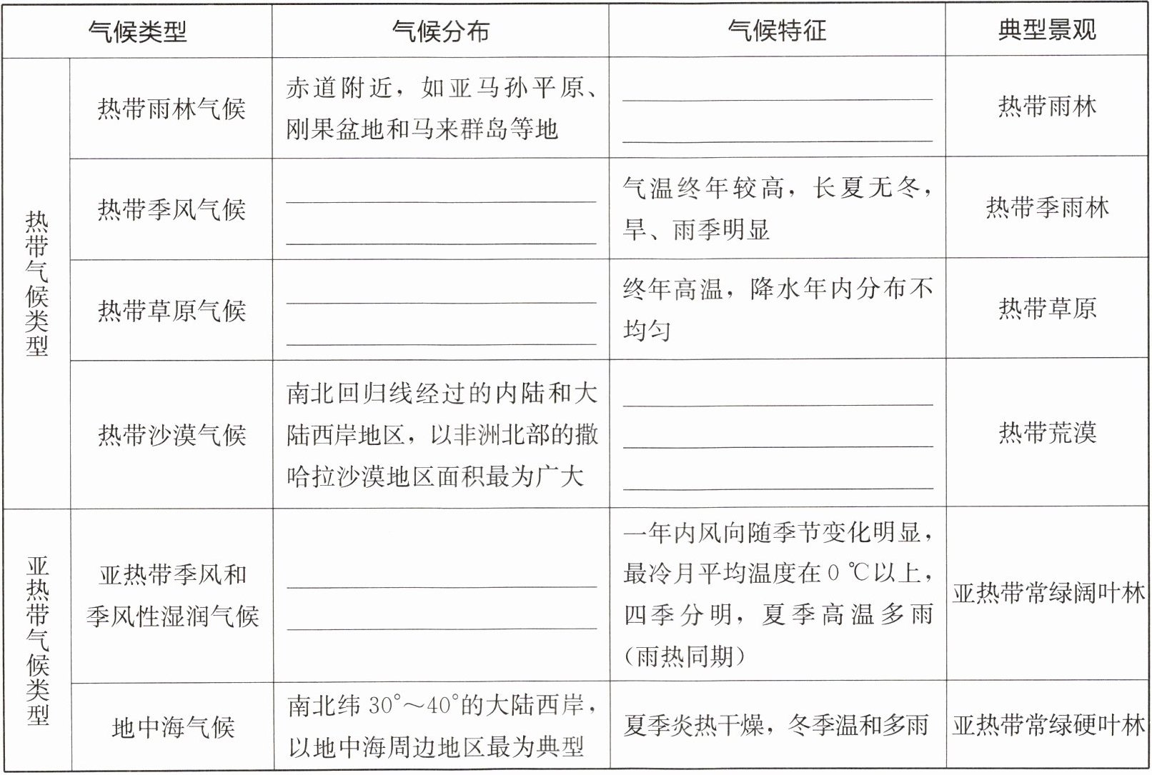 |亚热带气候类型|亚热带季风和季风性湿润气候|______|一年内风向随季节变化明显,最冷月平均温度在 $0^{\circ}C$ 以上,四季分明,夏季高温多雨(雨热同期)|亚热带常绿阔叶林|