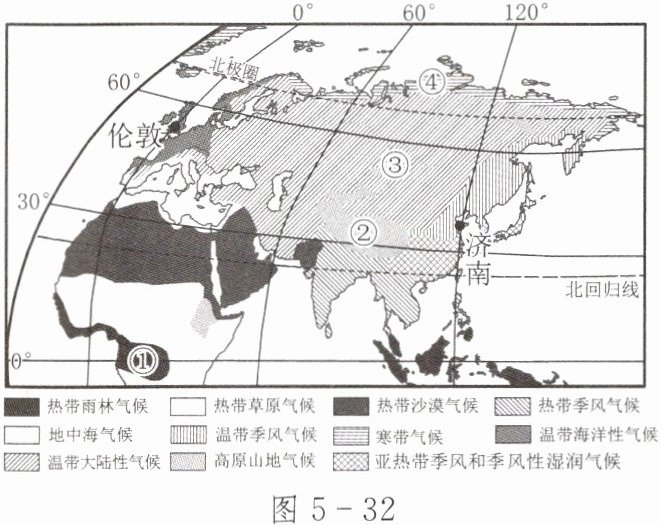 图 5 - 32 为世界气候类型分布图(局部)。读图,完成 4~6 题。