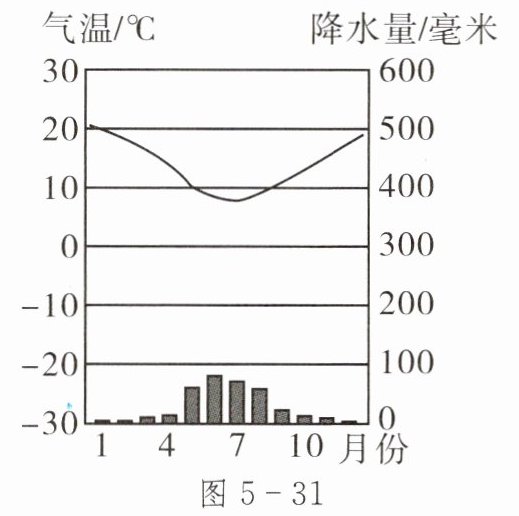 图 5 - 31 为某地气温年变化曲线和逐月降水量图。读图,完成 1~3 题。