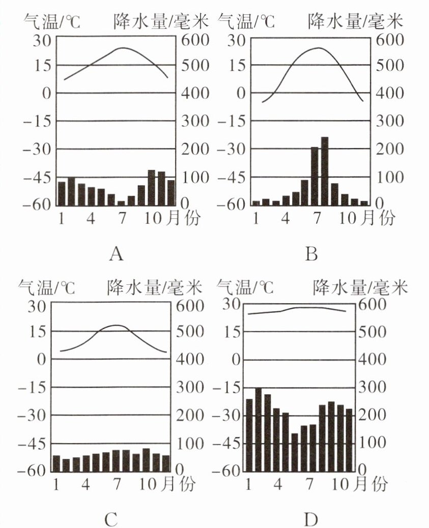 4. 老舍先生在《济南的冬天》里写道:对于一个刚由伦敦回来的人,像我,冬天要能看得见日光,便觉得是怪事。伦敦对应的气温年变化曲线和逐月降水量图是( )。