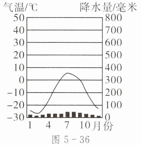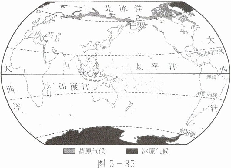 图 5 - 35 为寒带气候分布图,图 5 - 36 为巴罗的气温年变化曲线和逐月降水量图。读图,完成 9~11 题。