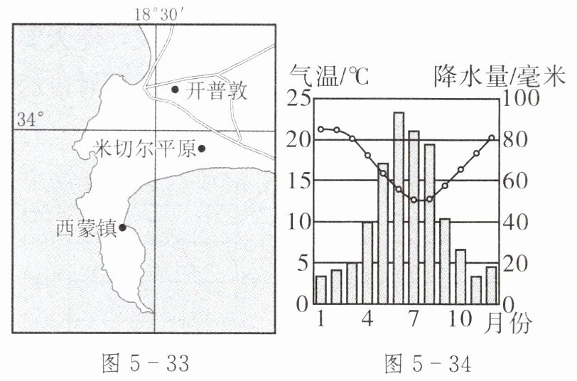 开普敦是南非著名的旅游胜地。图 5 - 33 为开普敦位置图,图 5 - 34 为开普敦气温年变化曲线和逐月降水量图。读图,完成 7~8 题。