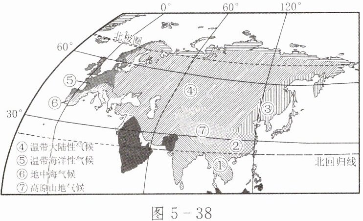 探究式学习是培养学生地理学科素养的一种重要的学习方法,某中学地理课堂以“探究气候”为主题开展探究性学习活动。图 5 - 38 为亚欧大陆主要气候类型分布图。读图文材料,完成下列各题。
