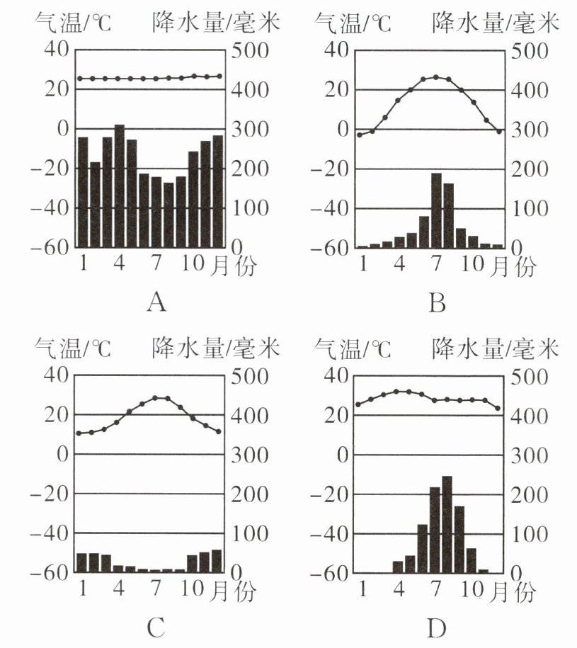 (1)热带季风 亚热带季风和季风性湿润 温带季风 (2)①②③为不同的季风气候类型,影响因素是纬度位置;③④⑤为中纬度地区的大陆东部、中部、西部,气候差异的主导因素是海陆分布。⑦位于青藏地区,为高原山地气候,主要影响因素是地形地势。 (3)B (4)D