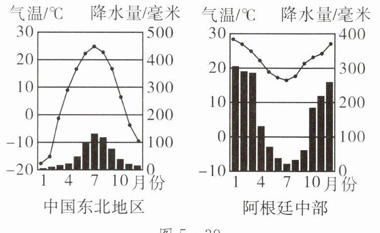 (4)大豆原产于中国,已有五千年栽培历史。中国东北地区为大豆主产区,一般在 4 月底播种,9 月底收获。现今大豆在世界各地广泛种植,其中阿根廷中部大豆产区在 9—10 月播种,次年 3—4 月收获。通过对比中国东北地区和阿根廷中部的气温年变化曲线和逐月降水量图(图 5 - 39)发现,大豆( )。