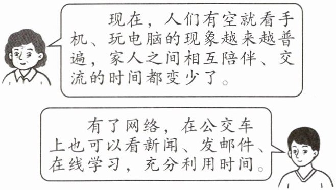 4.(1)网络改变了社会生活,我们在享受网络带来的便利的同时,也要全面认识网络,了解其可能衍生的社会问题,如家庭成员交流变少、过度沉迷于网络等。