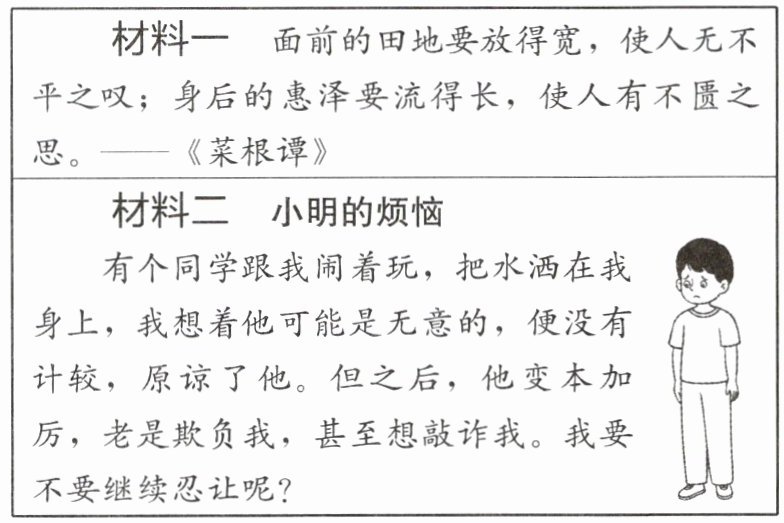 材料一 面前的田地要放得宽,使人无不平之叹;身后的惠泽要流得长,使人有不匮之思。——《菜根谭》