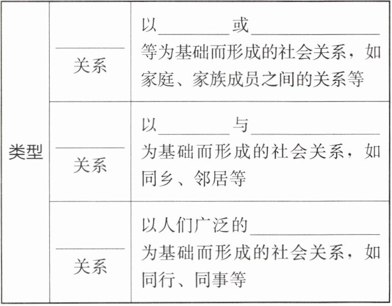 | |______关系|以______与______为基础而形成的社会关系,如同乡、邻居等|