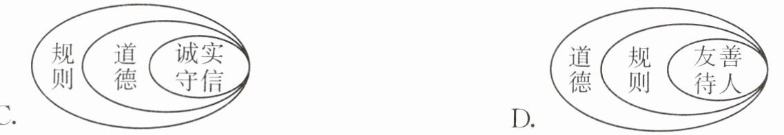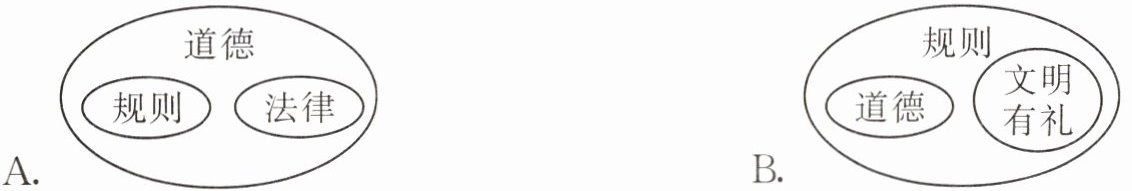 5. 小南用图示法对规则、道德、法律等内容的关系进行了梳理。下列图示中正确的是( )。