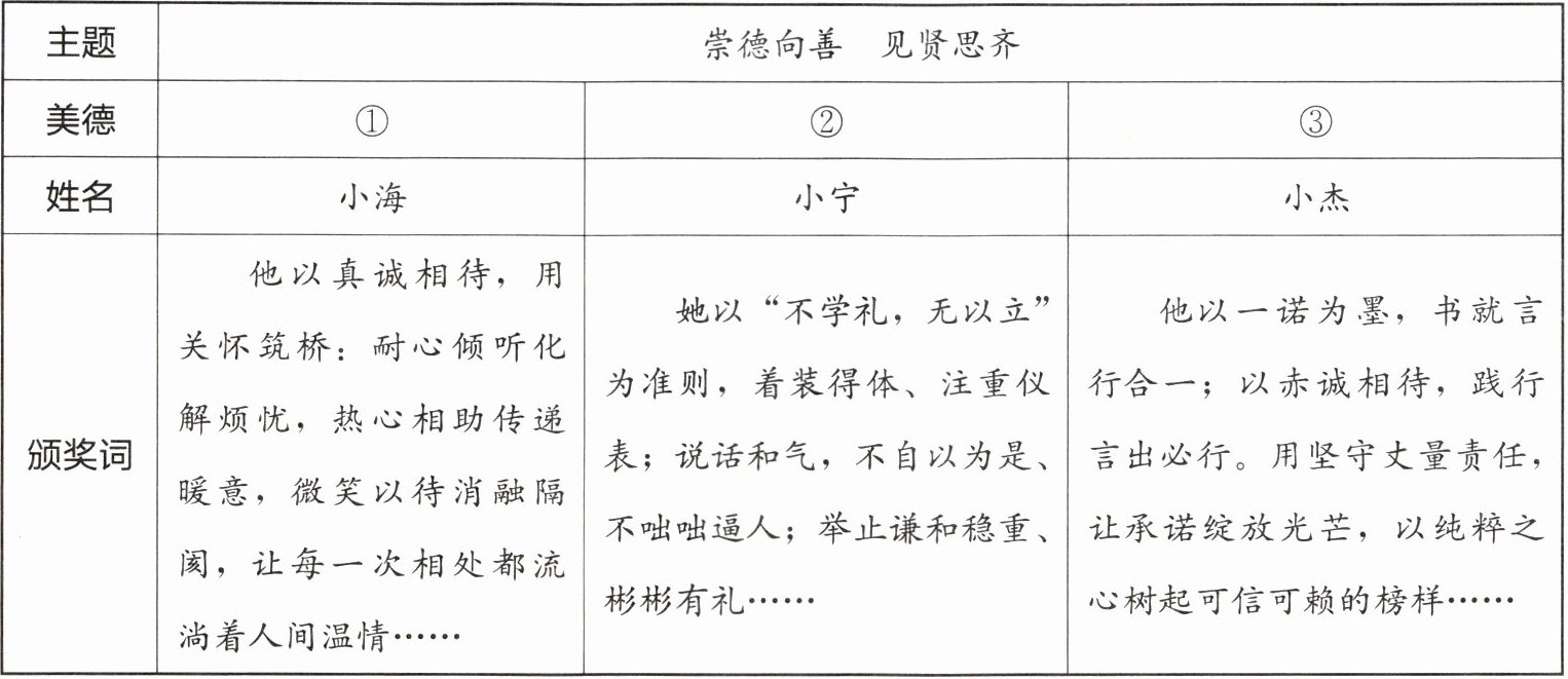 (1)以上三名同学的颁奖词中分别包含了哪些美德?请写出表格中序号对应的美德。