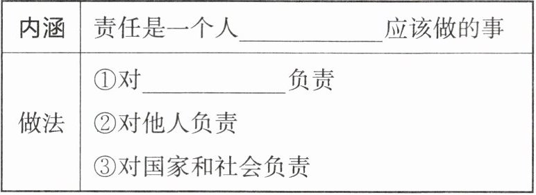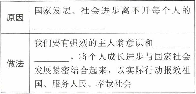 原因处填:努力和责任(或类似表达责任的词语,根据教材准确表述应为“努力和责任”,常见表述为每个人的“责任”与“努力” ,这里填“责任”也可,以教材核心意思为准,准确填“责任”);