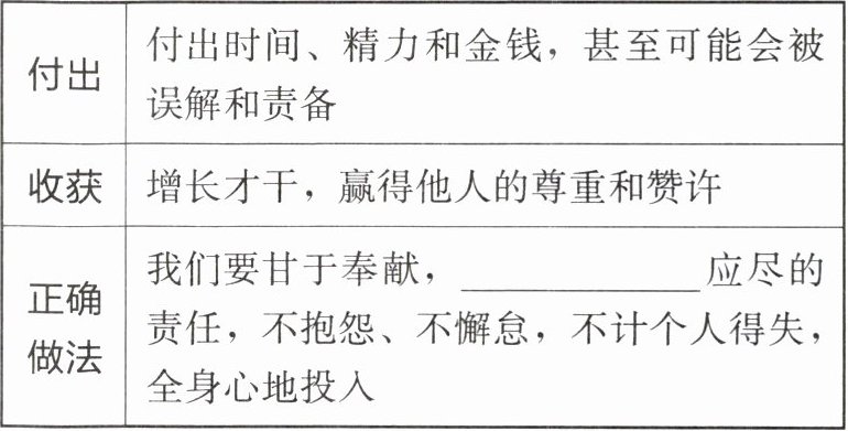 |正确做法|我们要甘于奉献,______应尽的责任,不抱怨、不懈怠,不计个人得失,全身心地投入|
