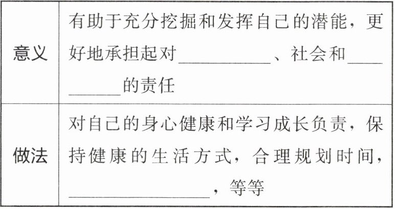 |意义|有助于充分挖掘和发挥自己的潜能,更好地承担起对______、社会和______的责任|