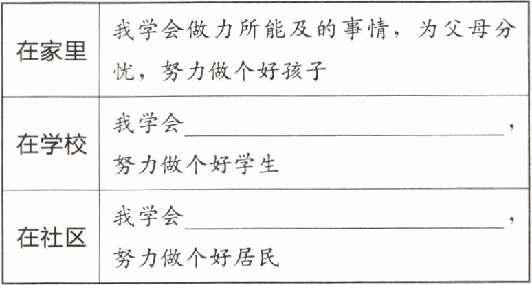 情,为父母分忧,努力做个好孩子||在学校|我学会______,努力做个好学生|