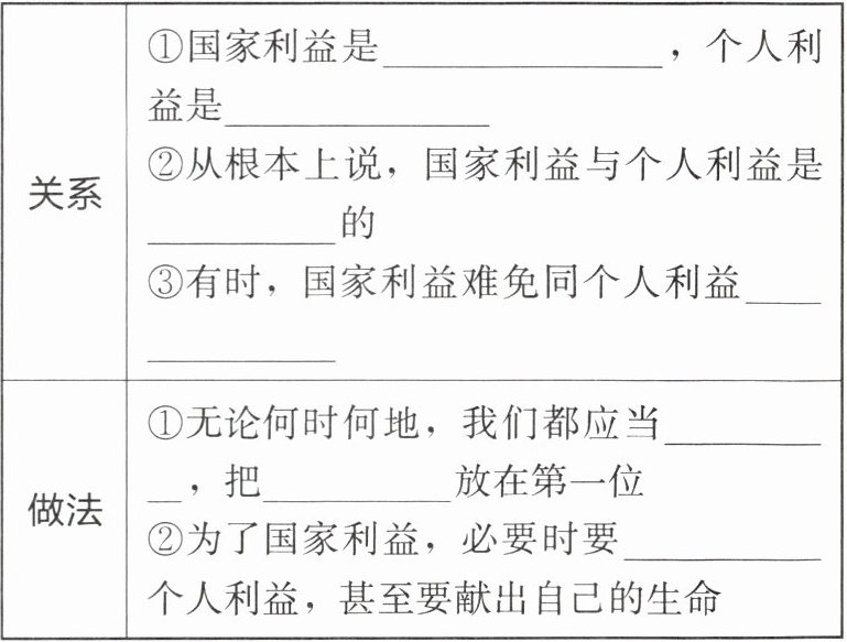 关系:①整体利益;局部利益;②一致;③发生矛盾;做法:①坚持国家利益至上;国家利益;②放弃