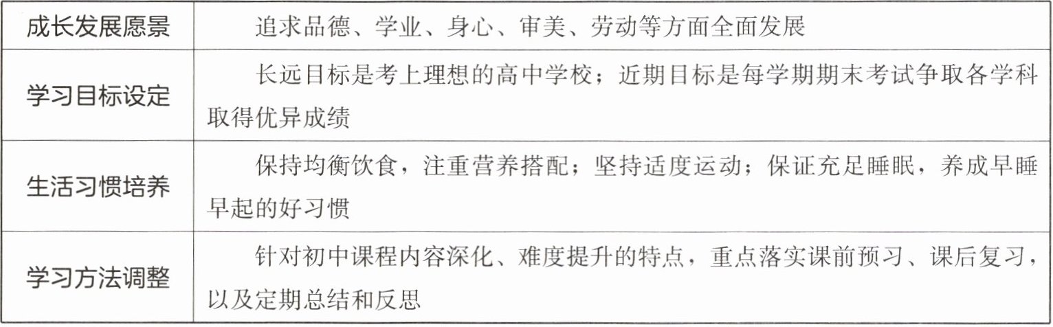(1)①在学习方面,小明设定了明确的学习目标,既有长远目标考上理想高中,又有近期目标争取各学科取得优异成绩,为学习指明方向。同时调整学习方法,重点落实预习、复习和总结反思,以适应初中学习。②在生活方面,小明注重健康的生活方式,保持饮食健康、适度运动和充足睡眠,为学习和成长提供良好的身体基础。③在个人成长方面,小明追求全面发展,注重品德、学业、身心、审美、劳动等多方面的提升,促进自身综合素质的提高。