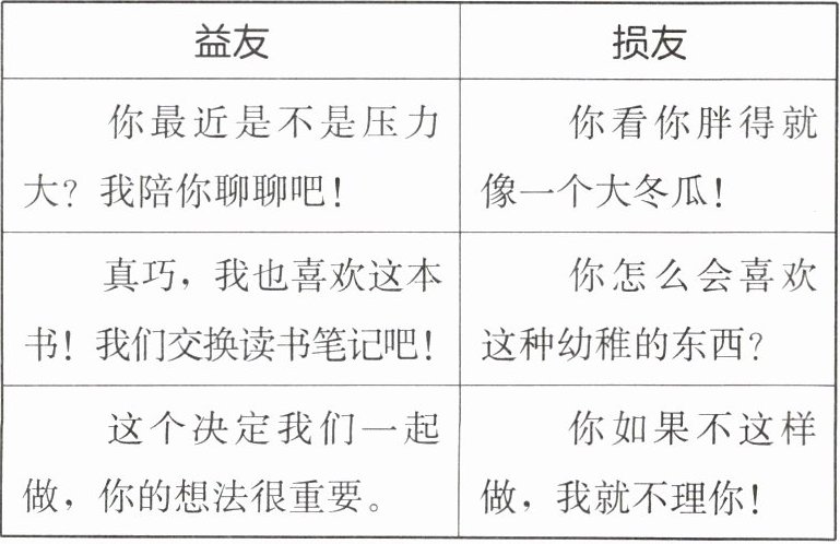(2)①朋友能给我们带来理解和帮助、关心和爱护。②朋友让我们享受更多的快乐和温暖,获得精神上的支持和满足。③朋友的帮助能让我们体验积极的情感,我们和朋友相互分担,在交流中共同成长。