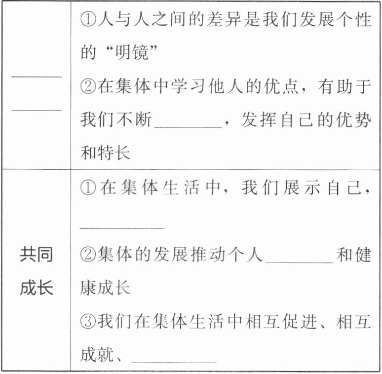 ②在集体中学习他人的优点,有助于我们不断______,发挥自己的优势和特长|