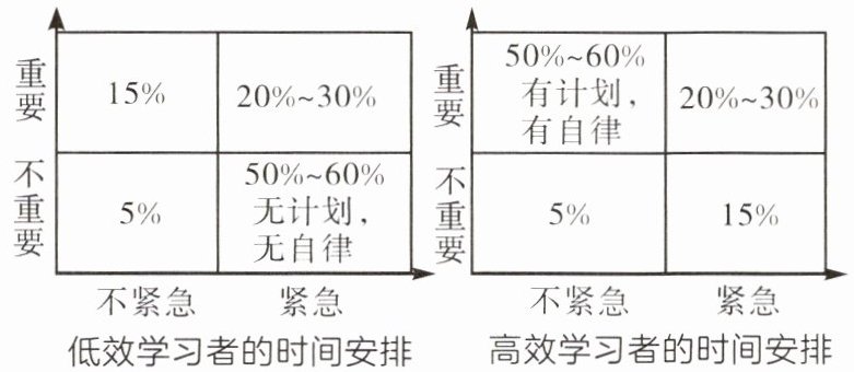 4. 课堂上,老师给同学们呈现了低效学习者与高效学习者的时间安排对比图(见下图)。这启示我们在学习时应该( )。