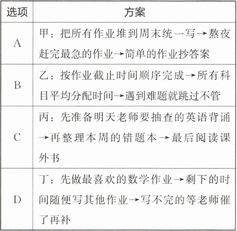 |D|丁:先做最喜欢的数学作业→剩下的时间随便写其他作业→写不完的等老师催了再补|