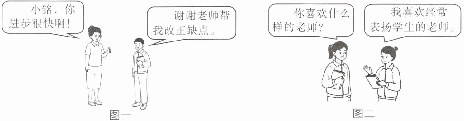 (1)①小铭正确对待老师的表扬与批评,是尊重老师的表现。②老师帮助小铭改正缺点并及时鼓励小铭,这说明老师是我们学习知识的引路人,有利于促进学生健康成长。 (2)图二右边女生的观点是错误的。①建设和谐的师生关系,需要正确对待老师的表扬和批评。②老师的批评意味着关心、提醒和劝诫,可以帮助我们反省自己、完善自我。③老师的表扬意味着肯定、鼓励和期待,激励我们更好地学习和发展。④对待老师的批评,我们应把注意力放在老师批评的内容上,理解老师的良苦用心。