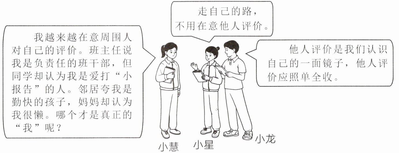 小星和小龙的观点都是错误的。理由:①他人的评价是我们认识自己的一面镜子,重视他人的评价有助于我们形成对自己更为客观、完整、清晰的认识。②用理性的心态面对他人的评价,是走向成熟的表现。小龙盲目听从他人的评价,小星过于忽视他人的评价,都没有正确认识和看待他人的评价,是不利于小慧正确认识自己的。③我们要客观冷静地对待他人的评价,既不盲从也不轻视。