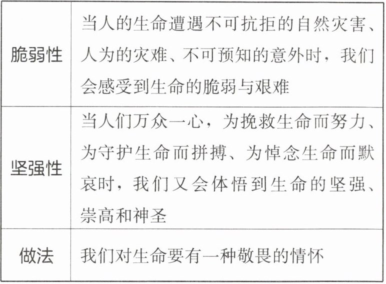 生命的脆弱性是指生命在自然灾害、人为灾难和意外面前的脆弱与艰难;坚强性是指人们为挽救、守护生命拼搏及悼念生命时体现的坚强、崇高和神圣,我们要敬畏生命。