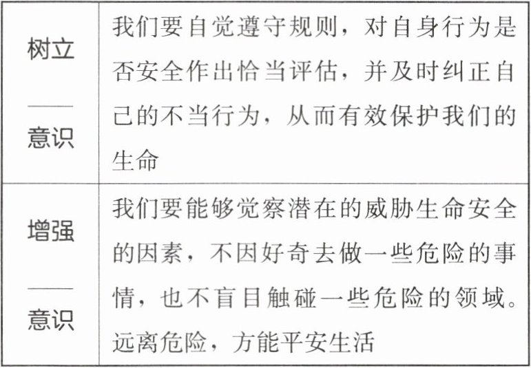 |增强____意识|我们要能够觉察潜在的威胁生命安全的因素,不因好奇去做一些危险的事情,也不盲目触碰一些危险的领域。远离危险,方能平安生活|
