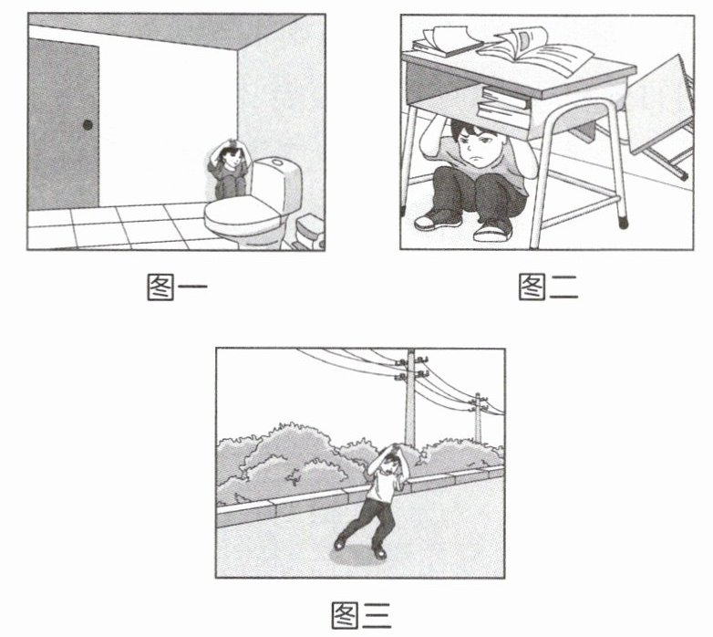 (1)图一:在家里,我们可以躲在床铺下面、桌子下面,或者卫生间的墙角处。图二:在教室里,我们可以躲在书桌下或墙角处。图三:在室外,我们要避开高大建筑物,如高楼、烟囱、水塔等;避开危险物,如高压线、变压器、电线杆、广告牌等。 (2)[示例] ①为什么要进行防震减灾知识的普及?②你知道多少防震减灾的常识?(符合实际、言之成理即可)