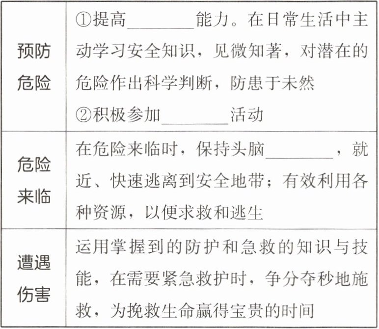 | 预防危险 | ①提高______能力。在日常生活中主动学习安全知识,见微知著,对潜在的危险作出科学判断,防患于未然