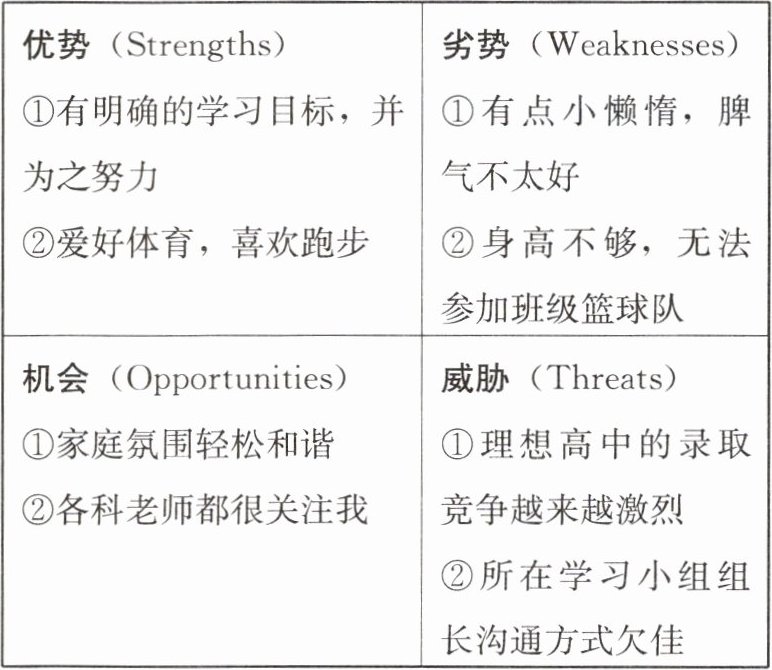 5. 只有正确地认识自己才能更好地成长。“SWOT分析法”是一种有助于分析自我的工具,下图是小桂的自我分析图。