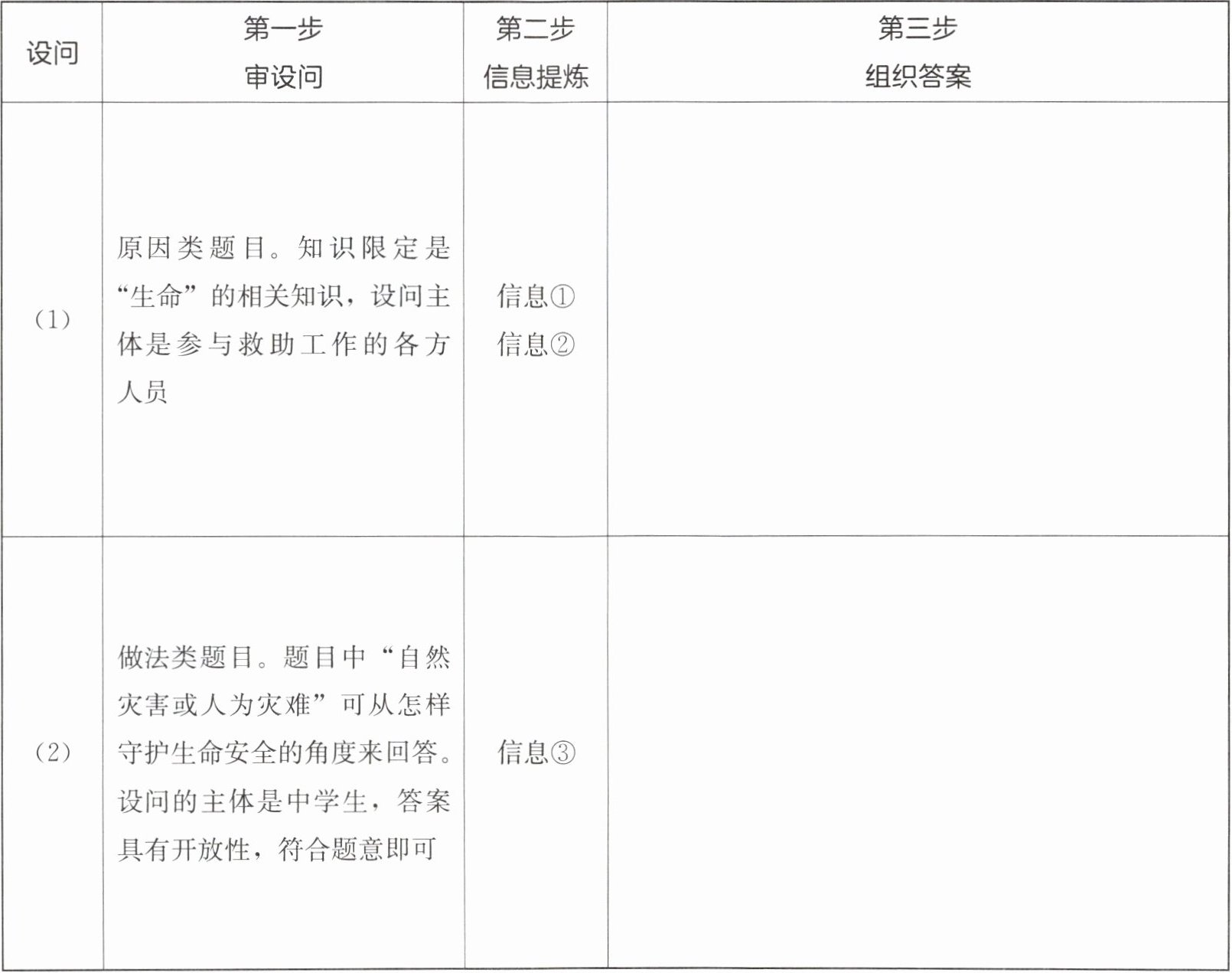 | (2) | 做法类题目。题目中“自然灾害或人为灾难”可从怎样守护生命安全的角度来回答。设问的主体是中学生,答案具有开放性,符合题意即可 | 信息③ | |