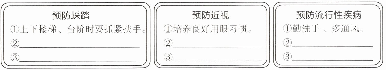 |①上下楼梯、台阶时要抓紧扶手。|①培养良好用眼习惯。|①勤洗手、多通风。|