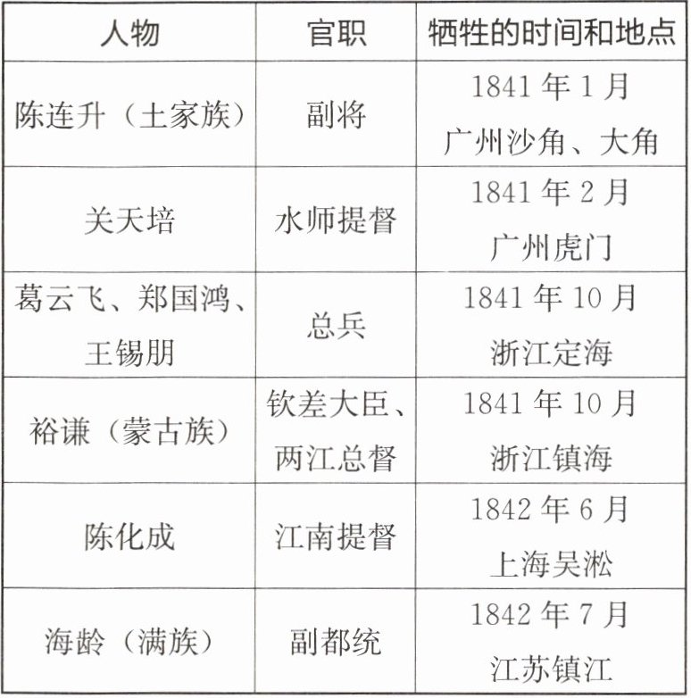 2. (2024年四川德阳)表1-2是中国近代某一次战争中壮烈捐躯的清朝著名将领一览表。据此可知,这些将领( )。