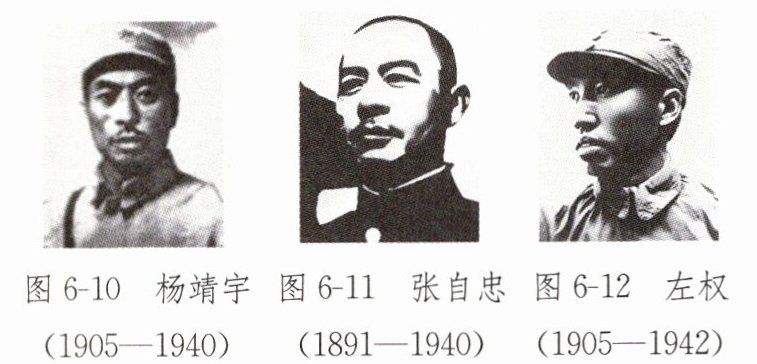 图6-10的英烈介绍:九一八事变后,杨靖宇在东北组织游击队开展抗日游击战争。图6-11的英烈介绍:在枣宜会战中,第三十三集团军总司令张自忠壮烈殉国。图6-12的英烈介绍:在反“扫荡”作战中,八路军副参谋长左权将军血洒疆场。(选择其中一位英雄人物进行介绍,言之成理即可)