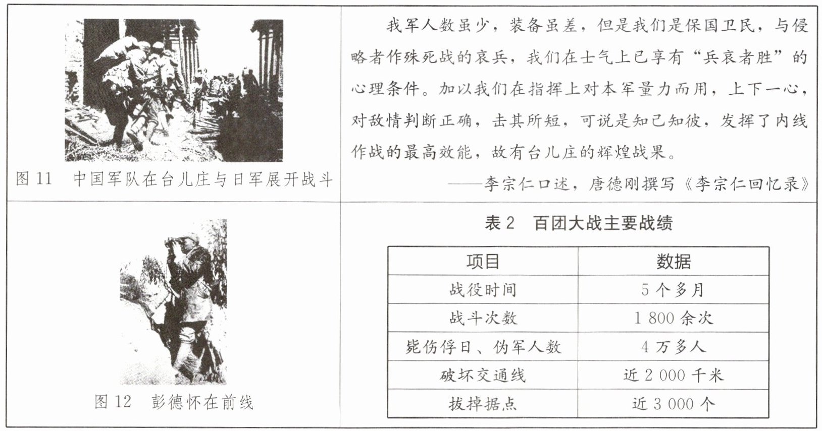 (1)根据以上材料,指出台儿庄战役的指挥者及这场战役能够取得胜利的原因,并写出百团大战的指挥者及作战特点。