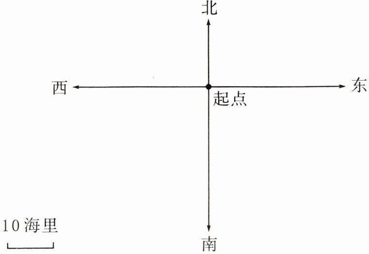 1. 以起点为中心,根据方向标,用量角器向西偏南$40^{\circ}$方向画射线,按比例尺(10海里为1单位长度)截取4个单位长度,确定该段终点。