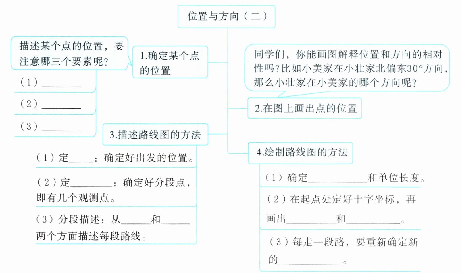 起点 (2)终点 (3)方向 距离 4.(1)起