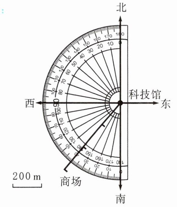 - 因为商场在科技馆南偏西$40^{\circ}$方向上,是以“南”为起始方向。