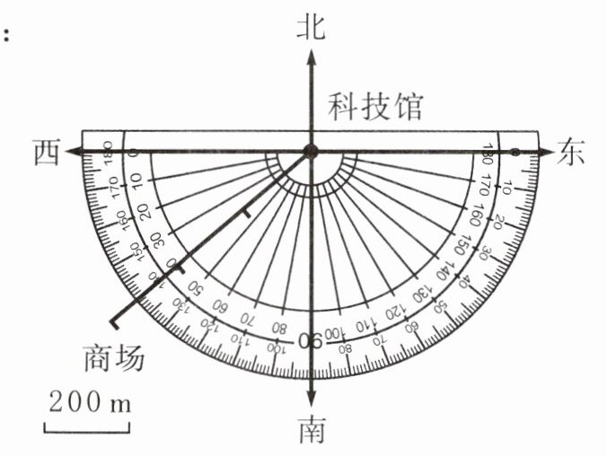 - 根据小提示,以南为起始方向时,把量角器竖着摆,这样能方便地将$0^{\circ}$刻度线与正南方向对齐,然后从正南方向开始向西量出$40^{\circ}$,再根据距离(图中比例尺$1$段表示$200m$,$600÷200 = 3$段)确定商场位置,这种摆法符合要求,是正确的。