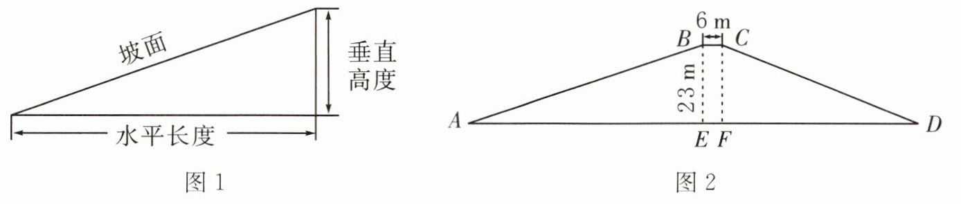 8 坡度,即坡面的垂直高度和水平长度的比(见图 1),这一数学概念广泛应用于淡水池塘养殖、水库大坝等方面。如图 2,水库大坝的横断面是梯形,坝顶宽 6 m,坝高 23 m,斜坡$$ AB $$的坡度是$$ 1 : 3 $$,斜坡$$ CD $$的坡度是$$ 1 : 2.5 $$,则坝底宽多少米?