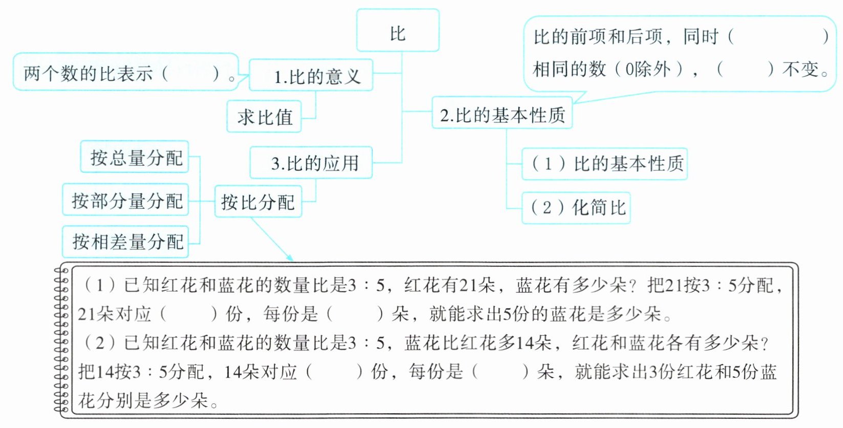 )朵,就能求出5份的蓝花是多少朵。(2)已知红花和蓝花的数量比是3:5,蓝花比红花多14朵,红花和蓝花各有多少朵?把14按3:5分配,14朵对应(