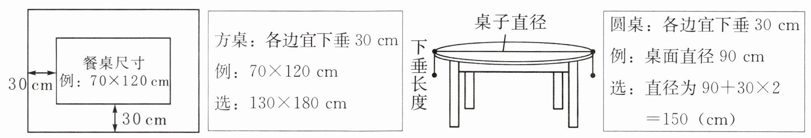 8 为家里的餐桌铺上合适的桌布,能营造温馨舒适的用餐氛围。在选择桌布时,确定尺寸很重要,因为桌布下垂的长度需恰到好处,过长或过短都会破坏美感。以下是某商家提供的尺寸选择参考数据: