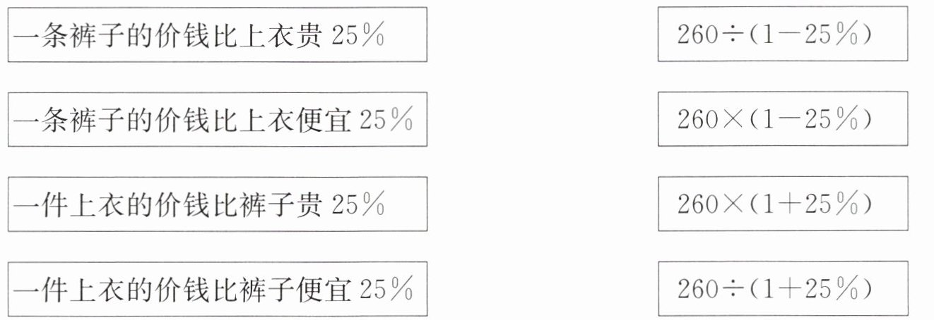 一条裤子的价钱比上衣贵25%—260×(1+25%);一条裤子的价钱比上衣便宜25%—260×(1-25%);一件上衣的价钱比裤子贵25%—260÷(1+25%);一件上衣的价钱比裤子便宜25%—260÷(1-25%)