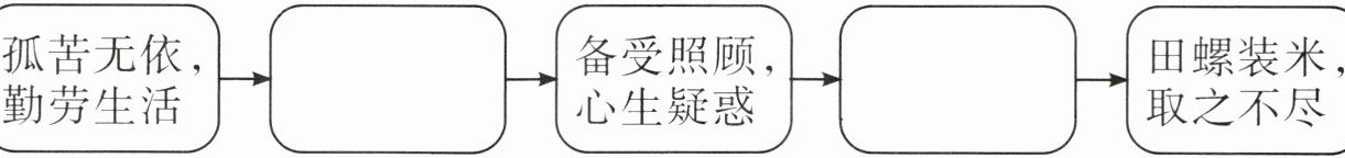 1.拾到巨螺,养在缸里 查明真相,仙女回天 3.[示例](1)大缸中冒出几缕白雾,过了一会儿,雾越来越浓,谢瑞几乎看不清屋里的东西了,他搓了搓眼睛再看,白雾中竟然走出一位漂亮的姑娘。姑娘穿着白上衣、青罗裙。她一走出来,身后的白雾就瞬间消散了。 (2)谢瑞更加辛勤地耕耘,把收获的粮食分给村里困难的人家,自己的日子也越来越好。虽然有媒人来给谢瑞提亲,但他心里仍然忘不了曾经悉心照顾自己的田螺姑娘。他日复一日的思念感动了上天,田螺姑娘下凡来到人间,与谢瑞结成了夫妻。 4.故事中谢瑞的身世令人同情,但他没有悲观沮丧,而是乐观地面对生活,辛勤劳作,最终获得了上天的眷顾。故事表达了人们希望勤劳善良的人都能获得幸福的愿望。