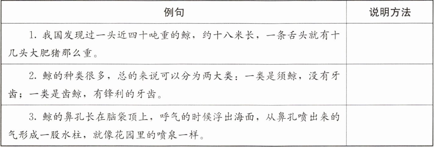 一、阅读教材中的习作例文《鲸》,判断下列句子所使用的说明方法。