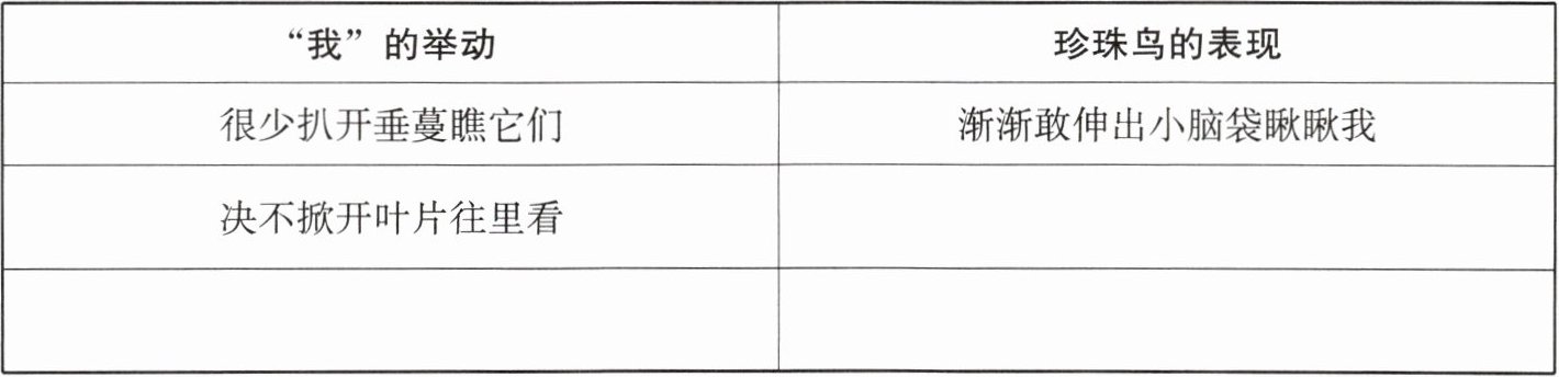 1. 填写表格,体会作者的举动与珍珠鸟的表现之间的关系。